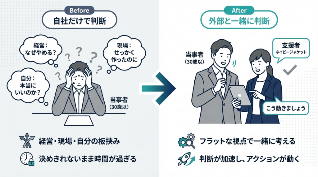 それは当然のことです。なぜなら、自社だけで判断して決めきるのは、構造的に難しいからです。