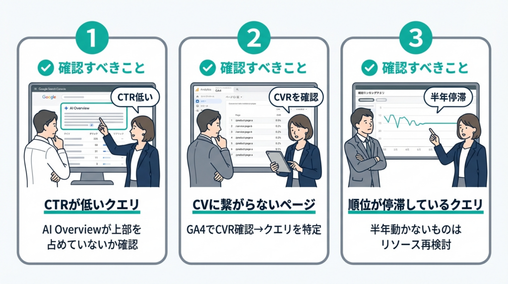 - 流入はあるがCVに繋がっていないページ:GA4の「ページとスクリーン」レポートでCVRを確認し、該当ページの主要クエリをSearch Consoleで特定