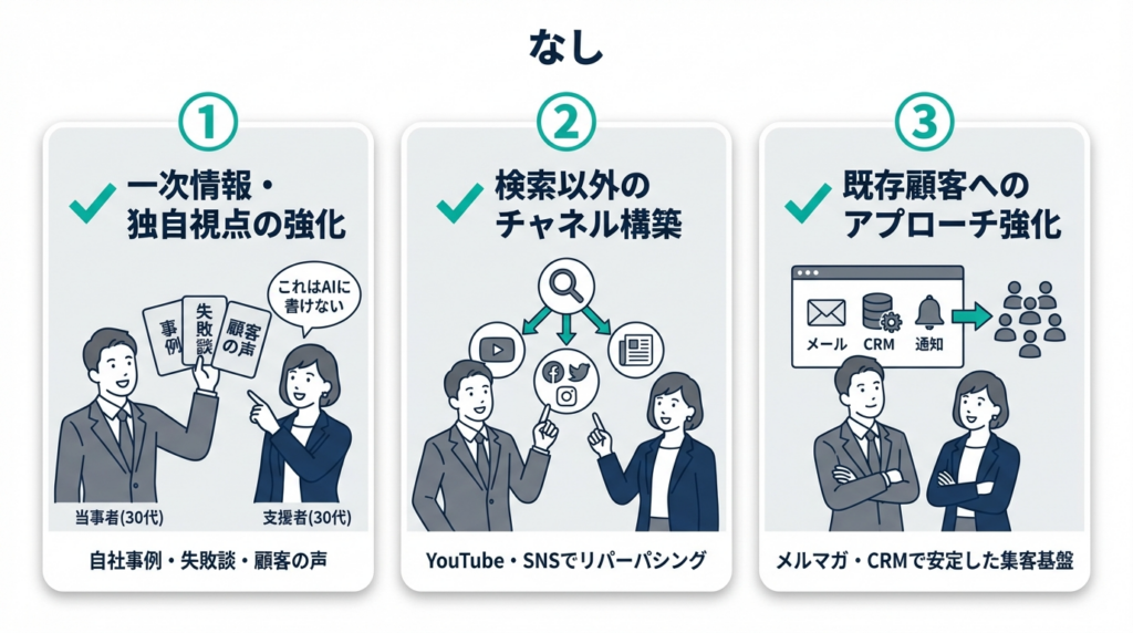 YouTube、SNS、メルマガ。これらは「SEOの代わり」ではなく、「検索だけに依存しない集客構造」を作るための手段です。