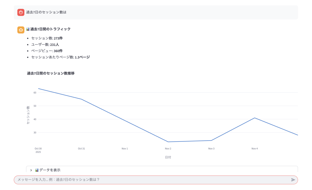 - 「過去7日間のセッション数は?」 → 2秒でサマリーとグラフ表示