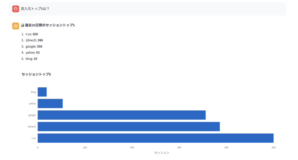 - 「流入元トップ5は?」 → 横棒グラフでランキング表示