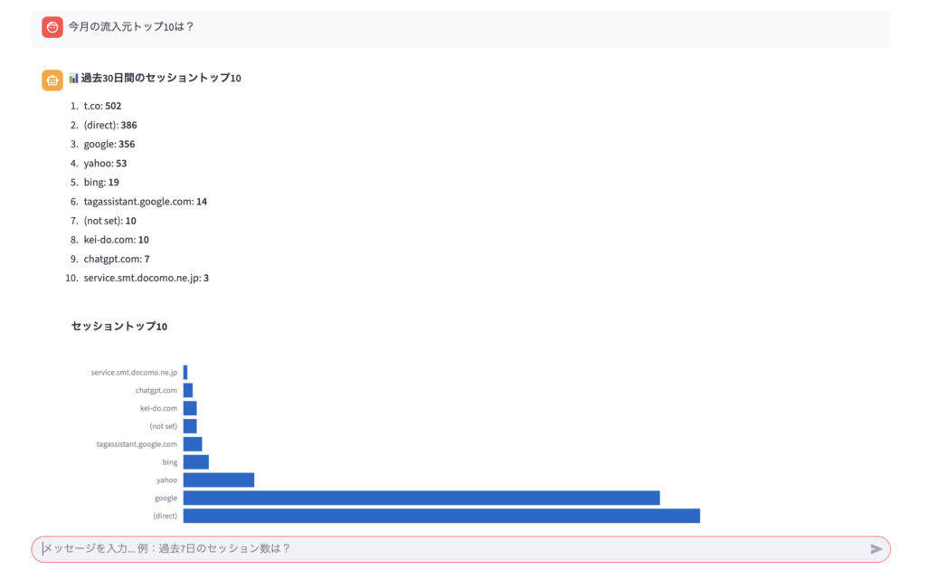 「今月の流入元トップ10は?」って聞けば、すぐに傾向が見える。