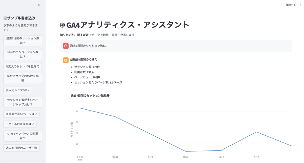ga4_client.pyでGA4 APIを叩いてデータ取得response_generator.pyでグラフとテキスト生成- Streamlitのチャット画面に表示
