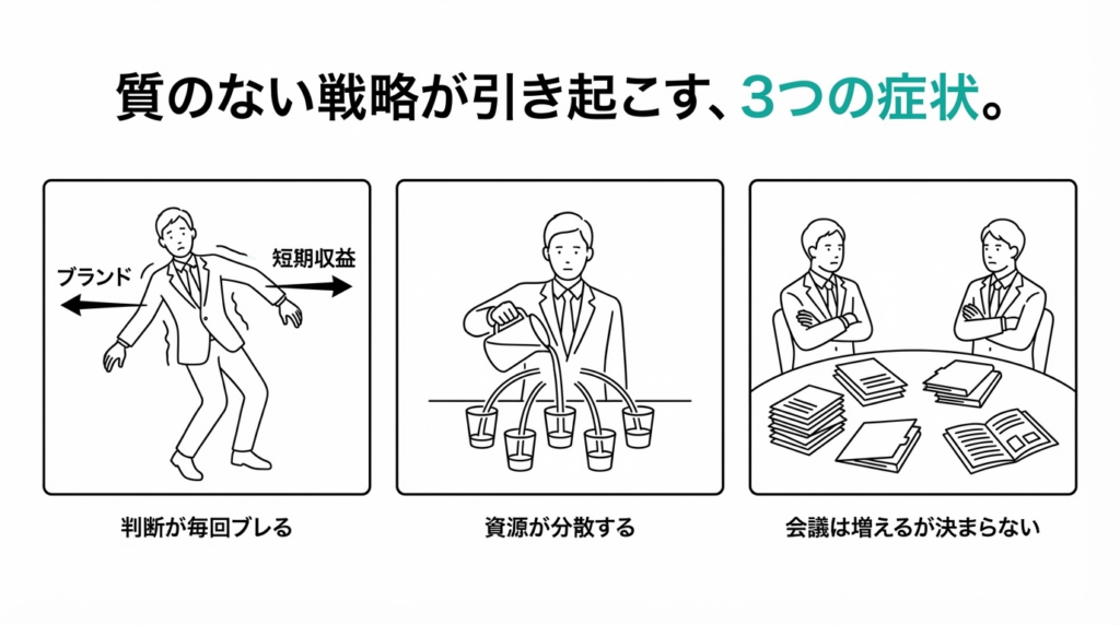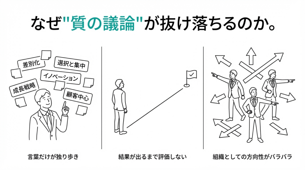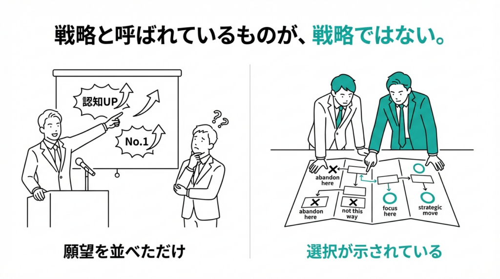 - 多くの企業では、「願望・ToDo・玉虫色」が“戦略”と呼ばれている