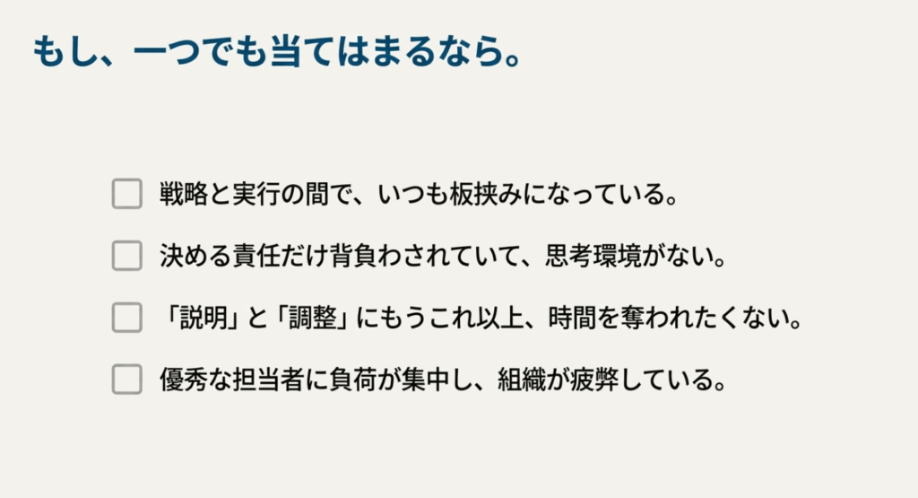 • 「考える・整理する・社内に説明する」だけで平日の大半が溶けていく