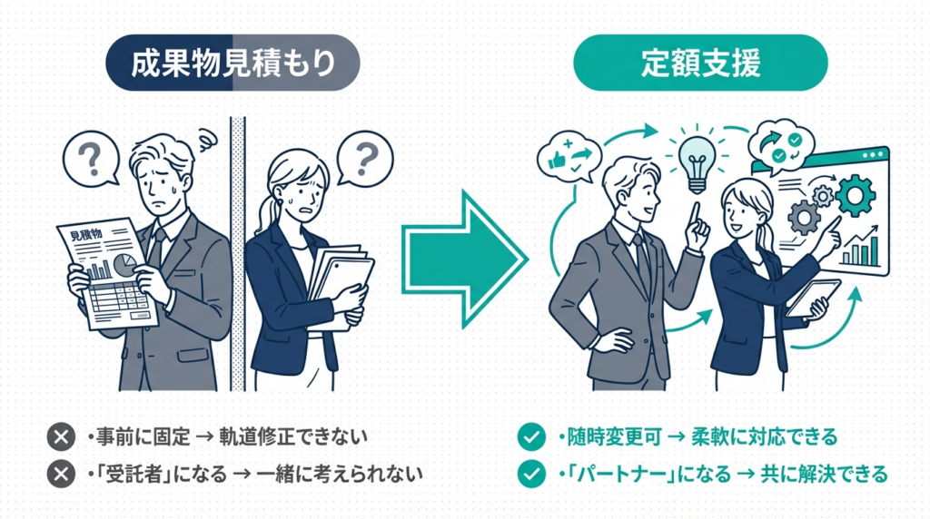 定額であれば、「今は何を優先すべきか」という問いそのものから一緒に考えられます。成果物単位では「何を作るか」が決まっていなければスタートできません。でも「何をすべきか分からない」という状態こそ、最も支援が必要な状態です。
