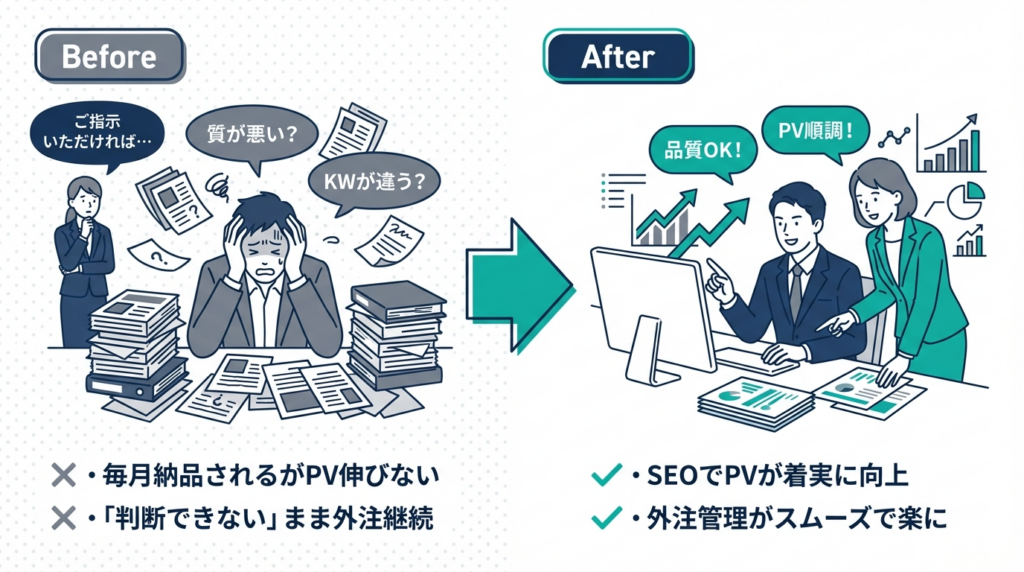 - 毎月記事が納品されるが、PVは伸びない