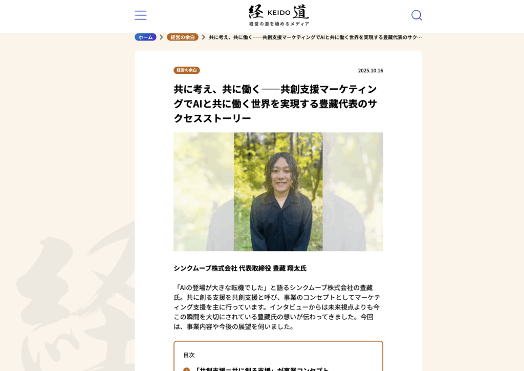 2025年10月16日公開のビジネスメディア「経道 KEIDO」にて、シンクムーブ株式会社 代表・豊藏翔太のインタビュー記事が掲載されました。