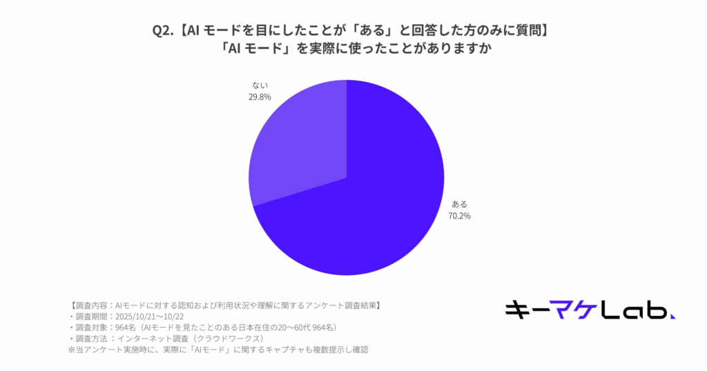 キーマケLabによる本調査では、20〜60代の一般ユーザー1,113名を対象に、AIモードの認知・利用実態・信頼感などを明らかにしました。